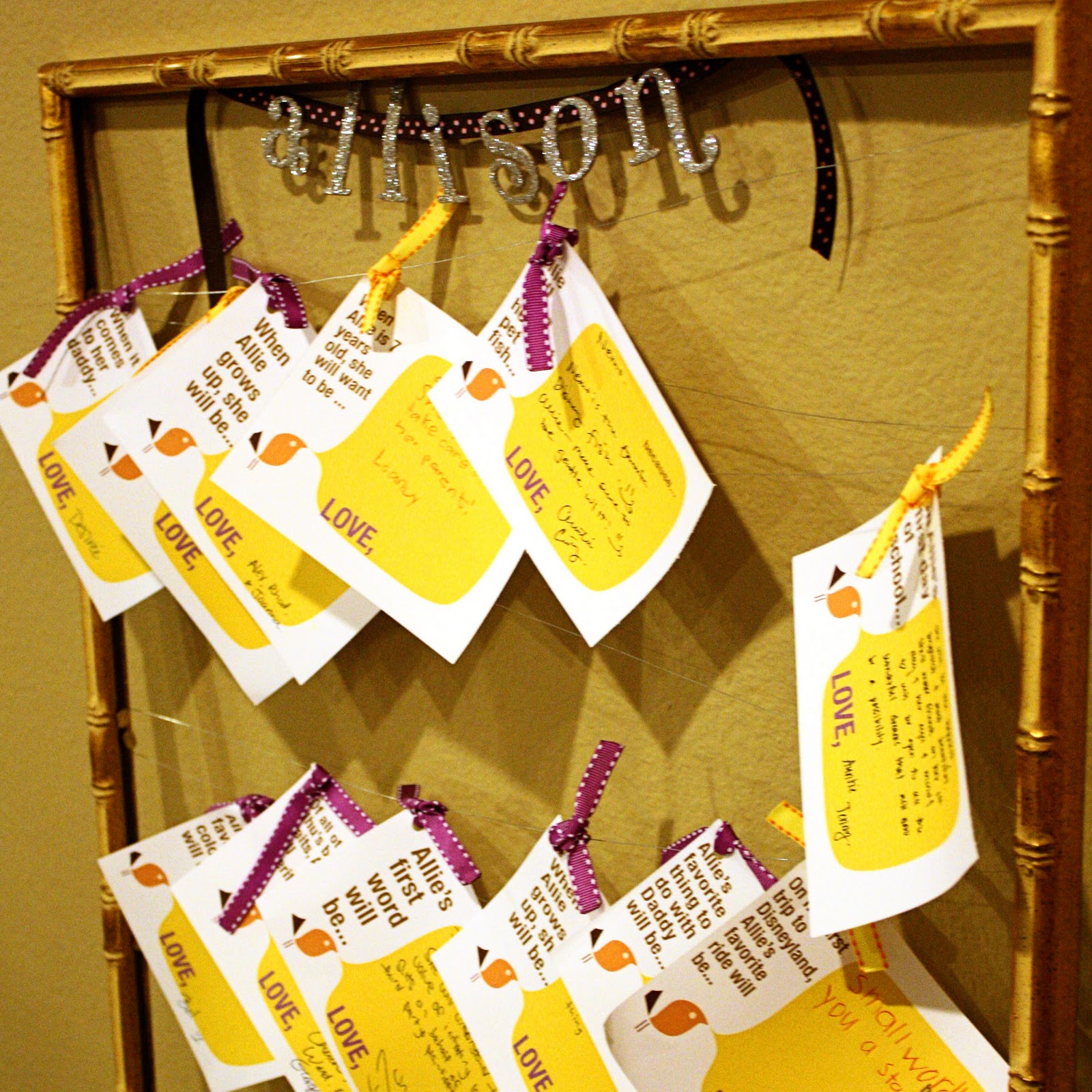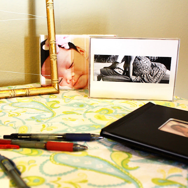 I found these acrylic frames at Michael's for insanely cheap, $2 and $3 for 5x7 and 8x10. I used the same scrapbook paper from the mobiles to decorate the sides of the frames. Nhu had photo books printed of both Allie and Ellie for the guests to look through.