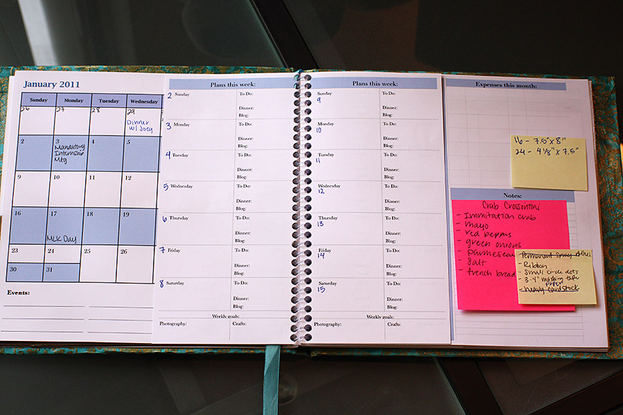 Most people know, I'm a doer, not a sit-around-and-wait-for-things-to-happener. If there's something I don't know, I'll look it up. If there's something I need, I'll make it myself. For the last 6 years, every December has been the same struggle to find the perfect planner. I do use my electronic calendar (iCal synced to goggle cal and phone) but that's only for when I'm out already, on the road, pulling up directions. The old fashioned paper planner is the ready deal. If you are penned in, considered it done. Last February, after I already broke down and bought a $30 one that I could customize, but still didn't quite fit my needs, I found the perfect (ready made) planner by Real Simple $17.