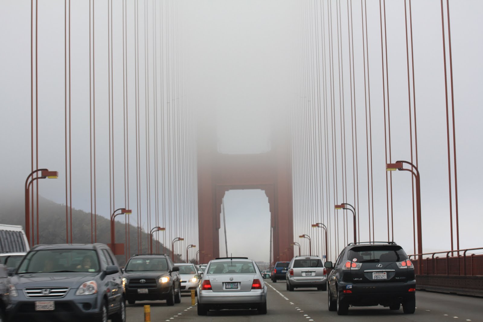 View of the Golden Gate in the Fog from the Pier 39 bridge.