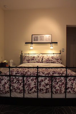 Bed frame, bedspread, lights, ledge, picture, and rug are Ikea, the grey sheets are Target.