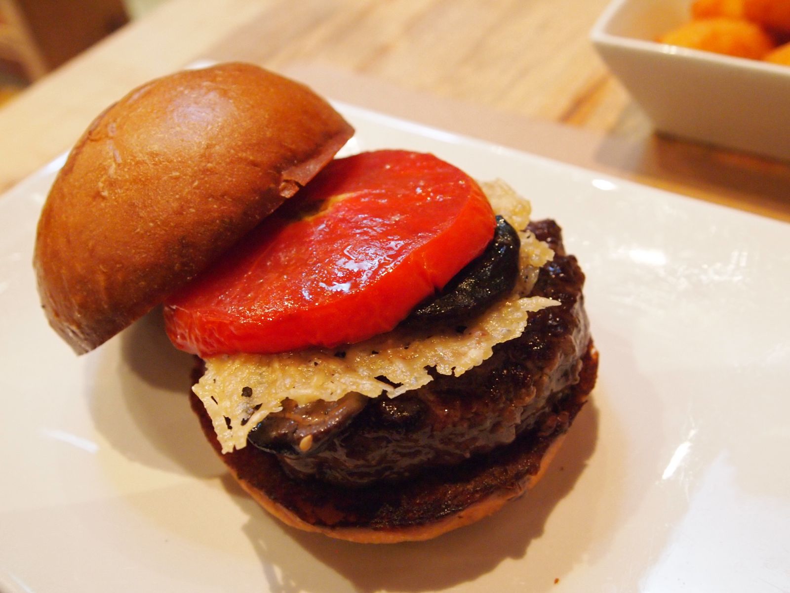 The classic Umami burger. Medium rare burger with shiitake mushrooms, caramelized onions, a parmesan cheese crisp, slow cooked tomato, all on a perfectly toasted bun for the perfect combination of crunchy, juicy and all around flavorful.